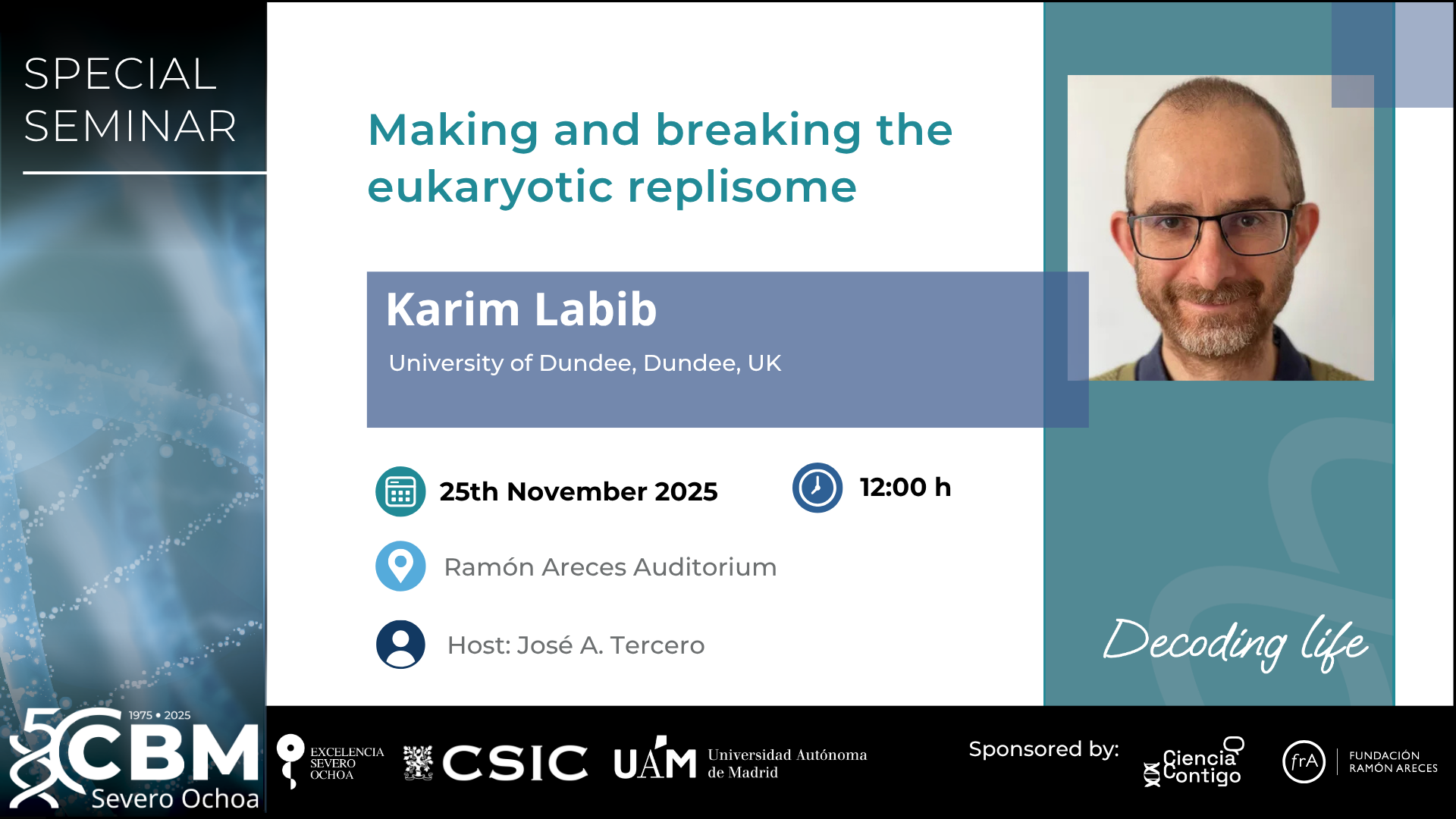 25 November Tuesday Making and breaking the eurkaryotic replisomeMaking and breaking the eurkaryotic replisomeDate: Tuesday, 25 November 2025Time: 12:00 - 13:30Venue: Sala Ramón Areces, CBMCategory: Special Seminar