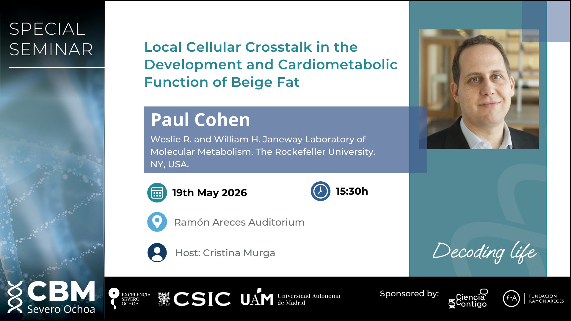 Local Cellular Crosstalk in the Development and Cardiometabolic Function of Beige Fat 19 mayoat15:30 - 16:30 Sala Ramón Areces, CBM C/ Nicolás Cabrera, 1, Madrid, Madrid, España Special Seminar