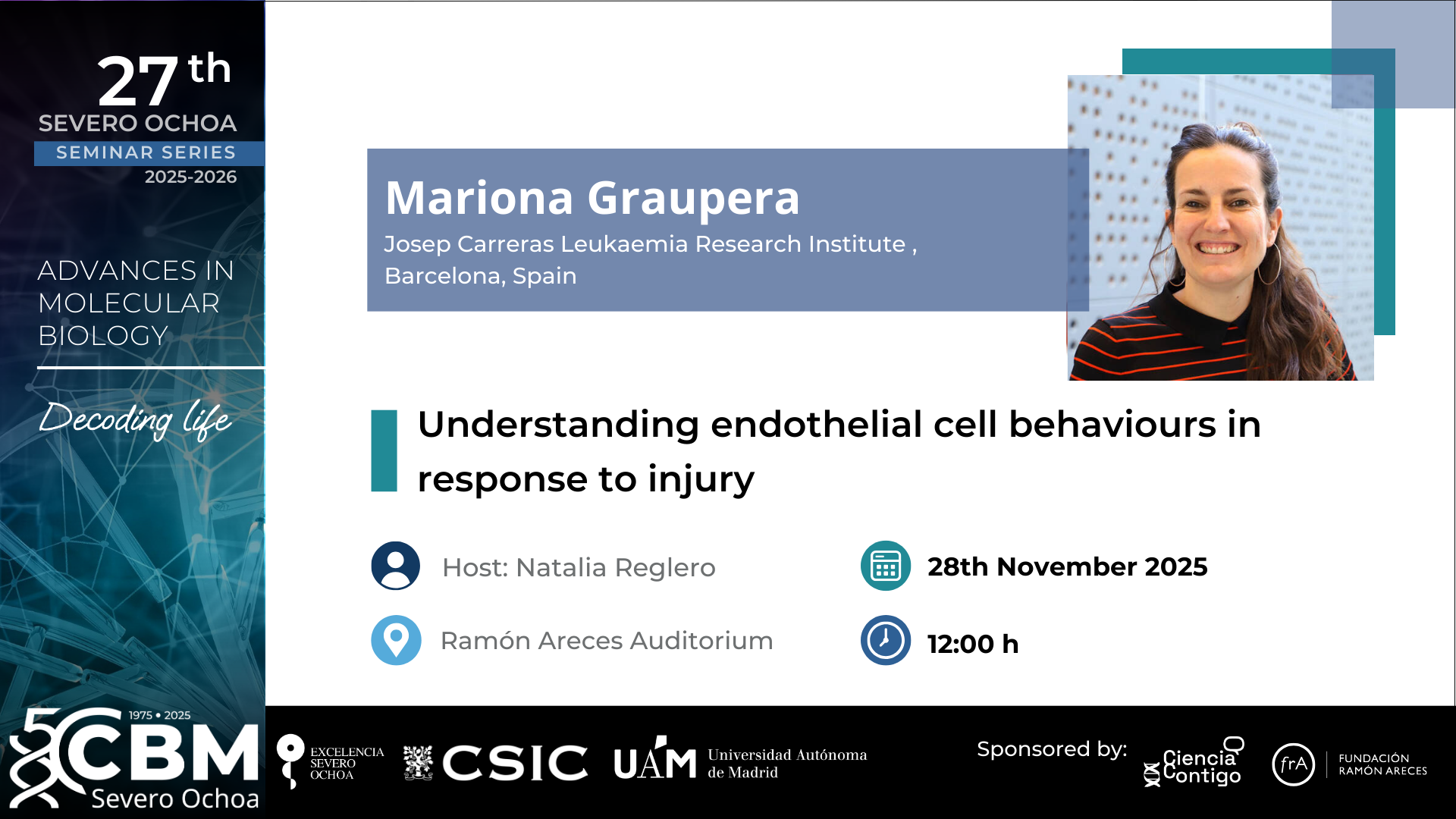 28 November Understanding endothelial cell behaviours in response to injuryUnderstanding endothelial cell behaviours in response to injuryDate: 11/28/2025Time: 12:00Severo Ochoa Seminar SeriesMore Info