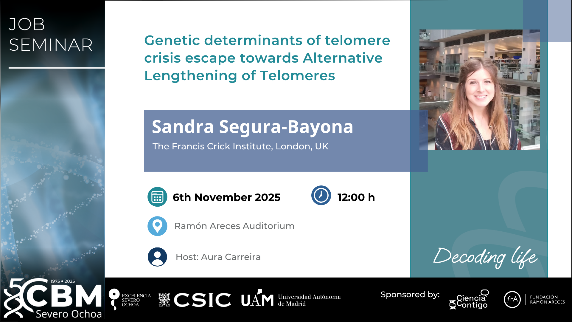 06 November Genetic determinants of telomere crisis escape towards Alternative Lengthening of TelomeresGenetic determinants of telomere crisis escape towards Alternative Lengthening of TelomeresDate: 11/06/2025Time: 12:00Job SeminarMore Info