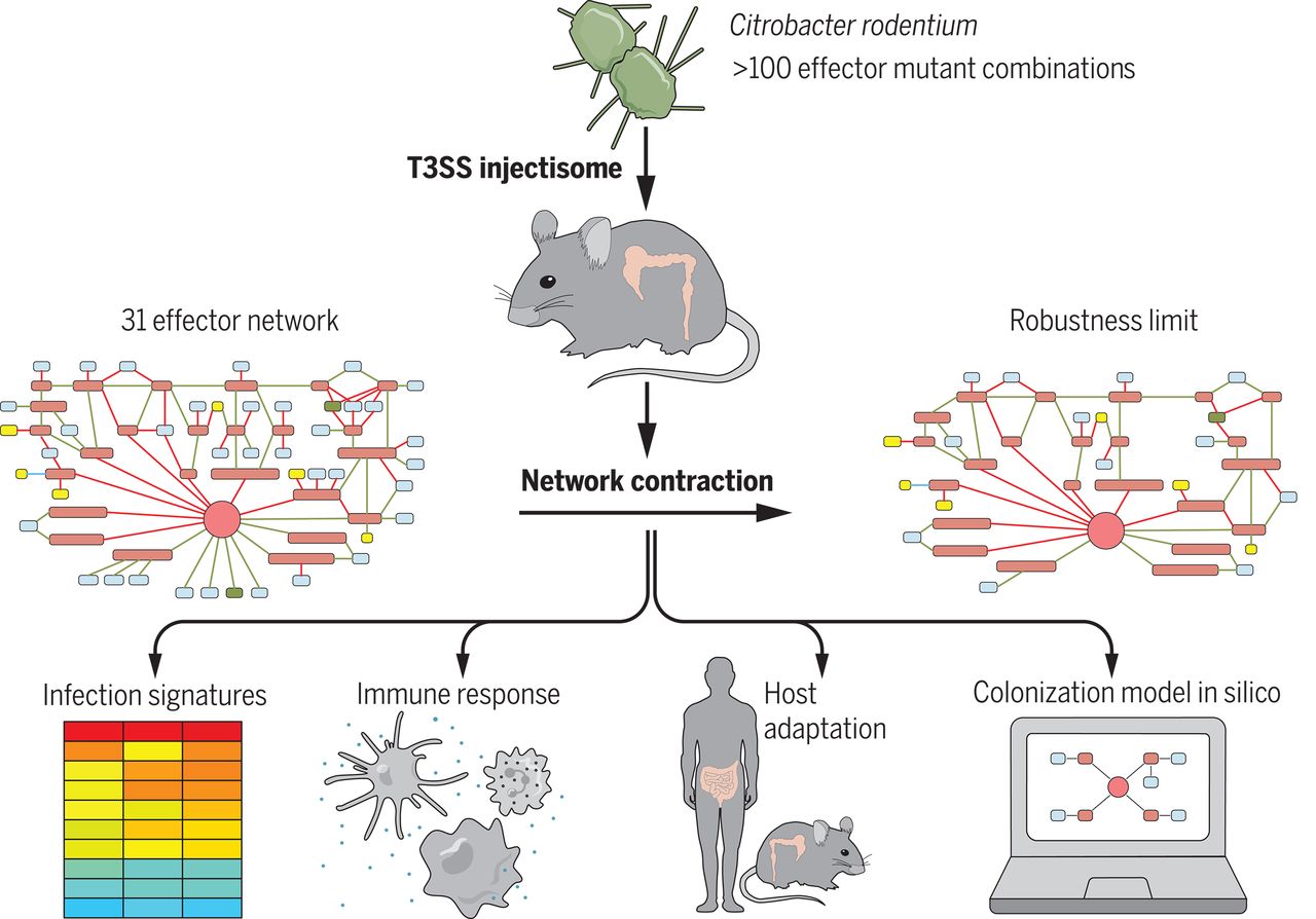 En nuestro laboratorio de investigación, nos enfocamos en estudiar cómo las bacterias patógenas utilizan un mecanismo especializado llamado Sistema de Secreción Tipo 3 para infectar el intestino y evadir las defensas del sistema inmunológico. Estas bacterias emplean proteínas específicas conocidas como proteínas efectoras, que establecen una red de interacciones crucial para su proceso de infección. Nuestro objetivo es desentrañar esta red de interacciones de proteínas para comprender mejor cómo ocurren las infecciones y cómo responde el sistema inmunológico a diferentes estrategias de infección. Para lograr esto, hemos creado cepas mutantes de estas bacterias patógenas. Luego, utilizamos estos mutantes para infectar ratones y observar los efectos que tienen en el intestino. Esto nos permite obtener información sobre los mecanismos detrás de la infección y la inmunidad.