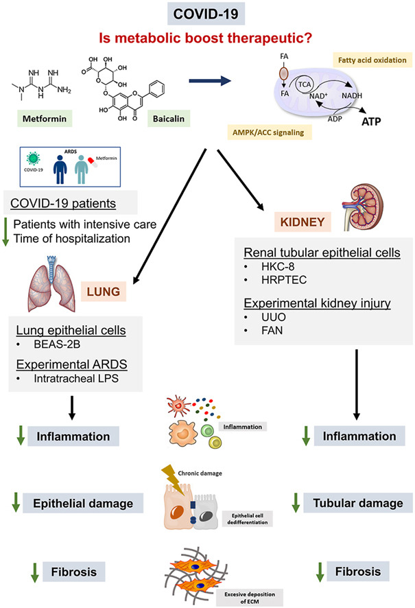 Enhanced fatty acid oxidation through metformin and baicalin as therapy for COVID-19 and associated inflammatory states in lung and kidney