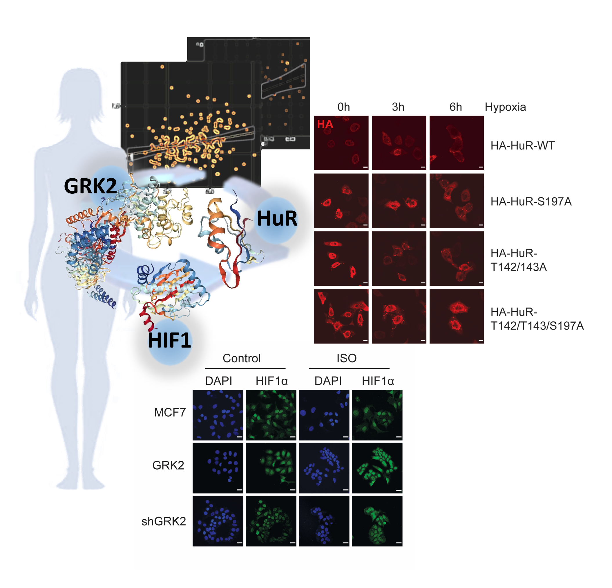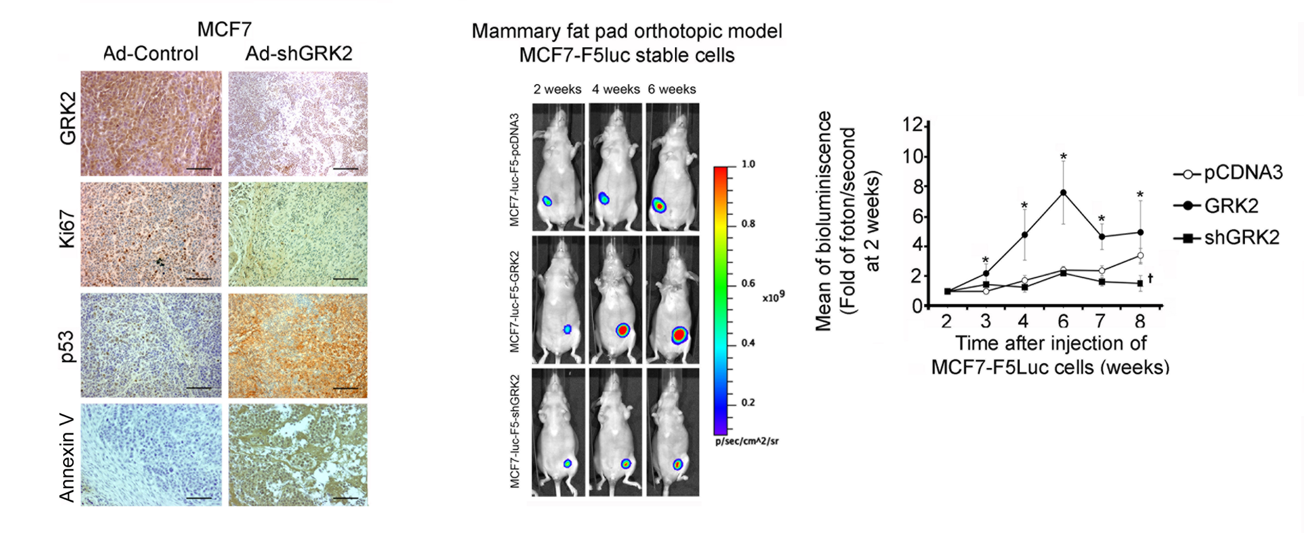 Resultados de nuestro laboratorio sugieren que la alteración coordinada de la serina-treonina quinasa GRK2 y la ligasa Mdm2 es importante en la transformación autónoma de las células, así como en la interrelación de la célula transformada con el micro-ambiente tumoral y el estado sistémico del paciente. Nuestros resultados indican que estas proteínas se modulan mutuamente de manera diferente en células epiteliales normales y en células tumorales, respondiendo distintamente a señales que estimulan receptores adrenérgicos y otros receptores acoplados a proteínas G (GPCR), o receptores tirosina-quinasa de factores de crecimiento (RTK).