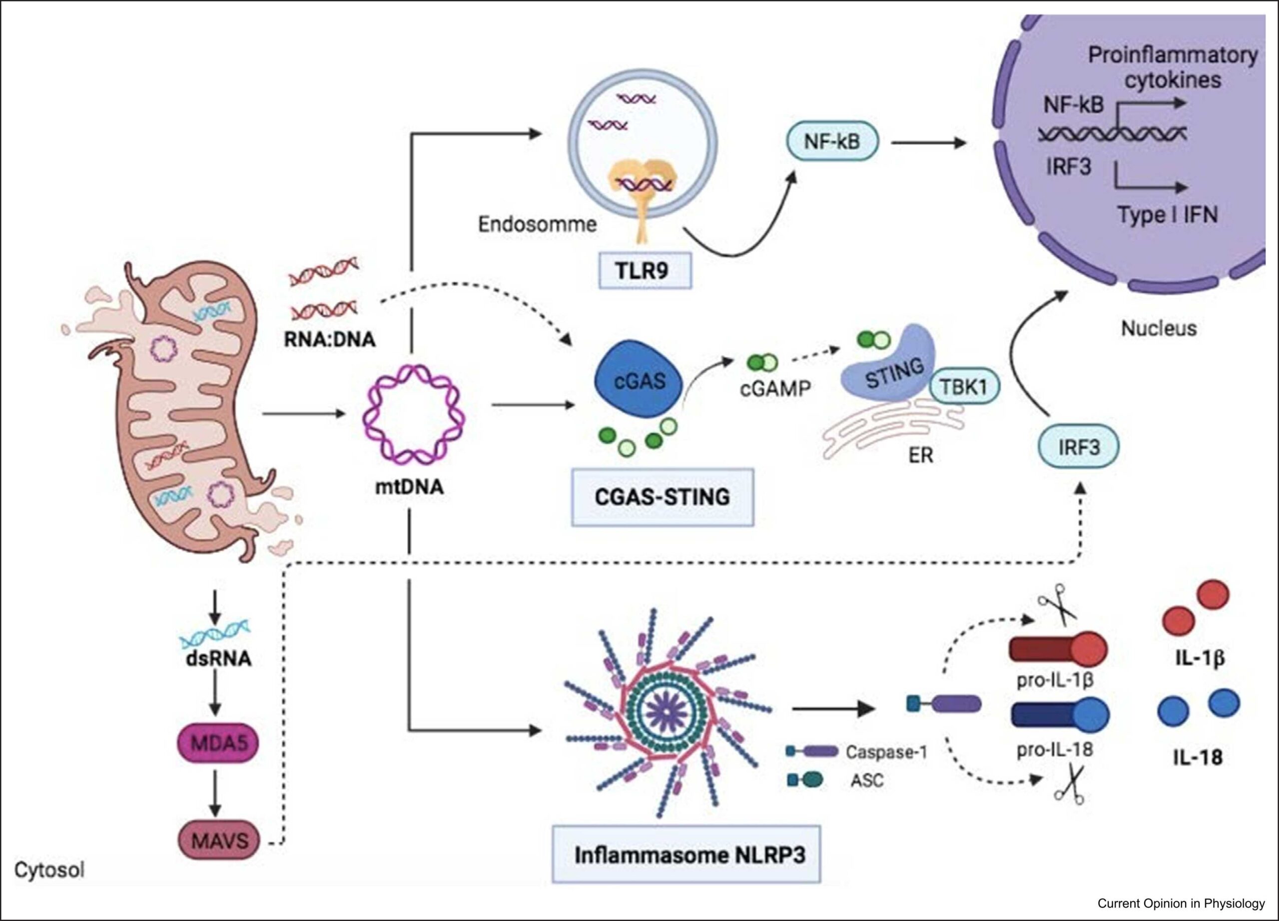 La mitocondria es considerada como la central energética de la célula pero, sin embargo, sus funciones son mucho más complejas. Además de su papel en la síntesis de ATP, también está involucrada en la generación de calor, señalización por calcio y su almacenamiento, detoxificación y señalización por especies reactivas de oxígeno (ROS), síntesis del grupo hemo y otras moléculas, y regulación de la muerte celular. Funciones emergentes de la mitocondria en enfermedad incluyen su papel como damage-associated molecular patterns (DAMPs), importantes para la inmunidad innata y adaptativa. En este contexto, la liberación de componentes mitocondriales (de origen bacteriano) al citosol, como el ADN mitocondrial, puede activar varias rutas de señalización que llevan a la secreción de citoquinas proinflamatorias (Fig. 1), un fenómeno al que se ha denominado inflamación estéril. La más estudiada de entre esas rutas es el inflamasoma NLRP3, un complejo citosólico multiproteico que detecta la presencia de ADN mitocondrial oxidado en el citosol (y por tanto funciona como un detector de disfunción mitocondrial) y que activa la caspasa 1, una enzima que a su vez corta otras proteínas, como los precursores de las citoquinas inflamatorias IL-1β y IL-18, o el inductor de piroptosis Gasdermina D, para dar lugar a sus péptidos maduros. El inflamasoma NLRP3 juega, por tanto, un papel fundamental en la inmunidad como iniciador de la respuesta inflamatoria, y está asociado a multiples enfermedades degenerativas relacionadas con el envejecimiento, como Alzheimer, asma, gota, isquemia/reperfusión, hipertensión, diabetes y psoriasis.