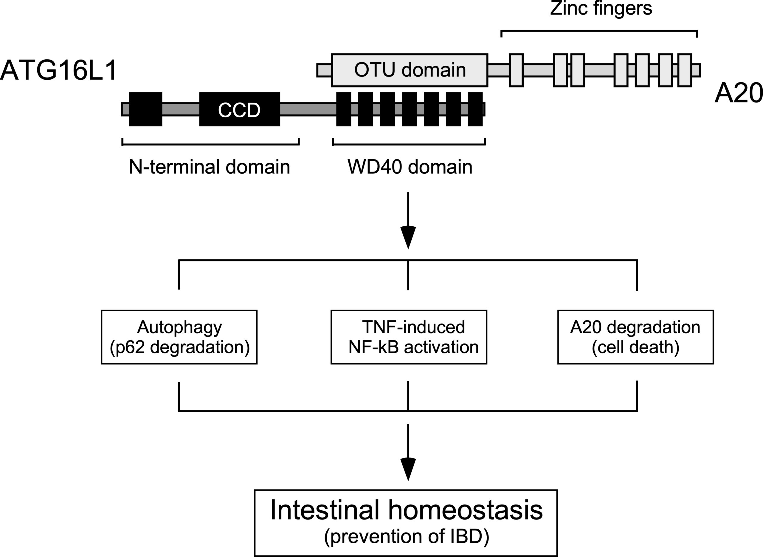 Physical and functional interaction between A20 and ATG16L1-WD40 domain in the control of intestinal homeostasis