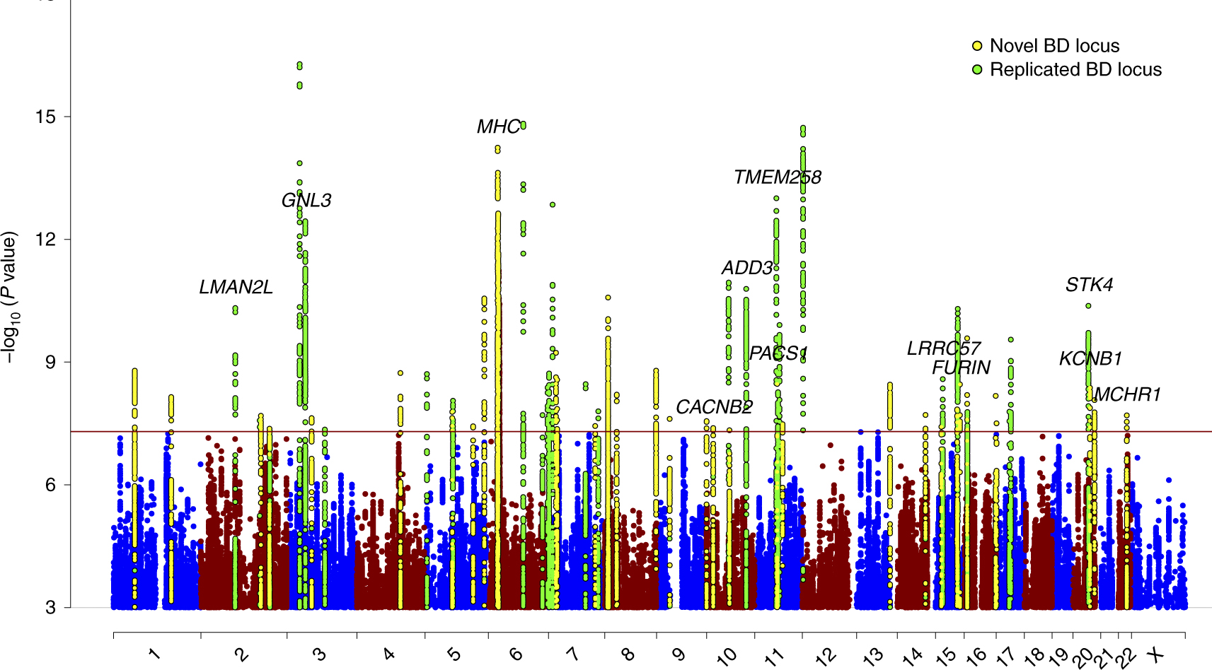 – Combination of linkage analysis with exome sequencing in a large cohort of multiplex bipolar families that identified a linkage peak (LOD score > 3) on chromosome 10q11-q21, which is explained by rare pathogenic coding variants, including those from ANK3 gene, which association to bipolar disorder is supported by genome-wide association studies (GWAS) data. This approach showed to be an effective method for gene discovery in complex disorders.