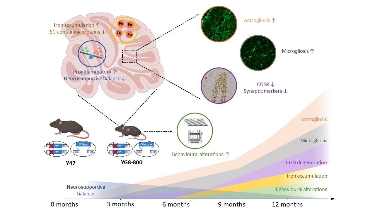 In the context of Friedreich’s ataxia, we have developed different neural cell models to study the molecular mechanisms of the neurodegenerative process triggered by frataxin deficiency. These studies have allowed us to identify processes such as iron-sulfur centre deficiency, a decrease in some mitochondrial respiratory chain complexes, the generation of reactive oxygen species, increased DNA damage, activation of the p53 protein, and activation of apoptosis as crucial elements in neurodegeneration. In addition, we have demonstrated an additional, very important role of astrocyte activation that contributes to the neurodegenerative process through neuroinflammatory and neurotoxic processes.