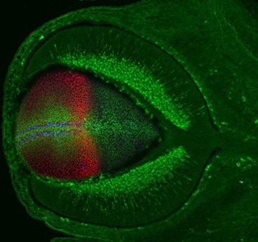 a) For over twenty years, our team has contributed to identify and study the molecular building blocks that coordinate the development of the vertebrate visual system. Building on this experience, we are now investigating how the retinal pigmented epithelium (RPE) forms and contributes to the overall architecture of the eye. The RPE consists of a monolayer of cells, positioned at the back of the neural retina. This tissue has the critical function of protecting, nourishing and cooperating with the light sensing cells of the retina: the photoreceptors. The cells of the RPE are initially neuroepithelial as those of the neural retina but soon transform in a cuboidal/squamous pigmented layer (Figure 1). The events underlying this transformation are still poorly understood. Using the zebrafish and chick embryos as models, we are studying the cellular and molecular aspects of this transformation and are further asking whether this transformation is necessary for the acquisition of the final cup-shape that the vertebrate eye has. In other words, we want to know what happens to the eye if the RPE does not develop correctly. As an extension of this question, we are also asking how the entire visual system adapts to the abnormal development of one of its parts. For example, what happens to the eye if the thalamic visual structures do not form in an appropriate manner?