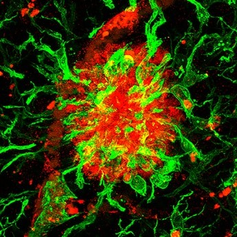 b) When the brain ages, the number of functional connections among neurons decreases and the brain assume a state of low but chronic “inflammation”. These changes are exacerbated in neurodegenerative diseases such as Alzheimer’s Disease (AD), in which there is also an accumulation of typical “amyloid plaques” (Figure 2). From a molecular point of view, loss of connections, inflammation and amyloid plaque formation have a commonality: the activity of the metalloprotease ADAM10. We have recently shown that a small secreted protein, known as Secreted Frizzled Related Protein 1 (SFRP1), acts as an endogenous inhibitor of ADAM10. Based on this observation, we hypothesized that abnormally upregulated SFRP1 levels in the brain of AD patients could impair ADAM10 activity and be a common trait of AD. Our work has validated this hypothesis, demonstrating that SFRP1 contributes to AD pathogenesis, whereas neutralization of its activity in a mouse model prevents the progression of the disease and the loss of memory present in AD (or in aging). Based on this exciting result and taking advantage of different transgenic mouse models that we have generated, we are now investigating the direct implication of Sfrp1 in the loss of brain connections and in the inflammatory events that take place in AD and aging. We are further exploring the potential of SFRP1 neutralization as a therapeutic strategy against AD.